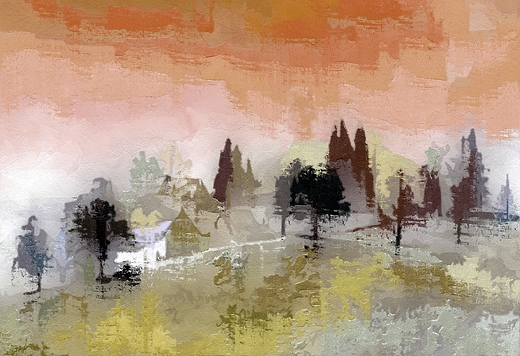 Ein malerisches Dorf erwacht in der sanften Umarmung der Morgendämmerung, wo sanfte Orangetöne die Landschaft überfluten.